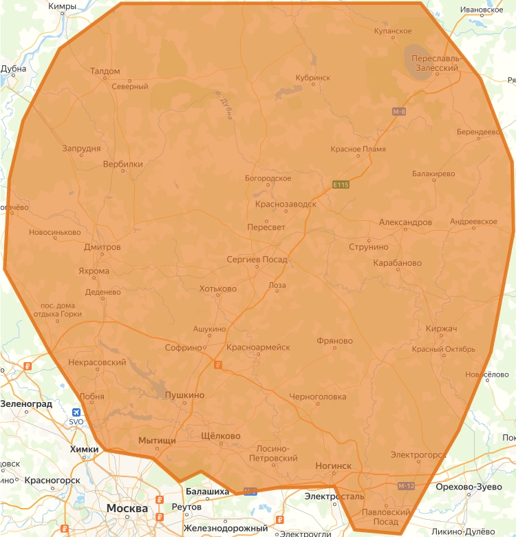 Дмитровский район, Ногинский район, Талдомский район, Долгопрудный, Королёв, Лосино-Петровский, Мытищинский район, Павловский Посад, Пушкинский район, Сергиево-Посадский район, Фрязино, Черноголовка, Щёлковский район, Александровский район, Киржачский район, Лобня, Икша, Некрасовский, Яхрома, Орудьево, Запрудня, Вербилки, Краснозаводск, Струнино, Карабаново, Хотьково, Софрино, Красноармейск, Фряново, Ивантеевка, Электрогорск и близлежащие населённые пункты внутри выделенной зоны.